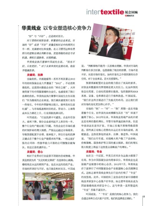 而在另一个层面,华美又在同步为这盘大棋摆子布局,作为中国服装协会的理事单位,华美线业也是服装产业联盟中的核心会员,2012年7月,华美线业在宁波举行了中国服装协会产业联盟核心会员授牌仪式。这标志着华美线业率先在行业内打响了“专业”的攻坚战。此外,中国纺织工业协会的首家中国缝纫线技术研发中心会落户在华美,标志着华美线业成为国家级缝线技术研发中心,这与华美一直所塑造的“专业”形象不谋而合。
