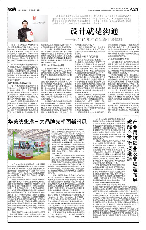 《中国服饰报》2012年11月5日在A23版,发表题为《华美线业携三大品牌亮相面辅料展》的文章,全面关注了华美产品和发展战略。华美立志成为中国缝纫线专家,已经日益得到越来越多行业媒体的关注。