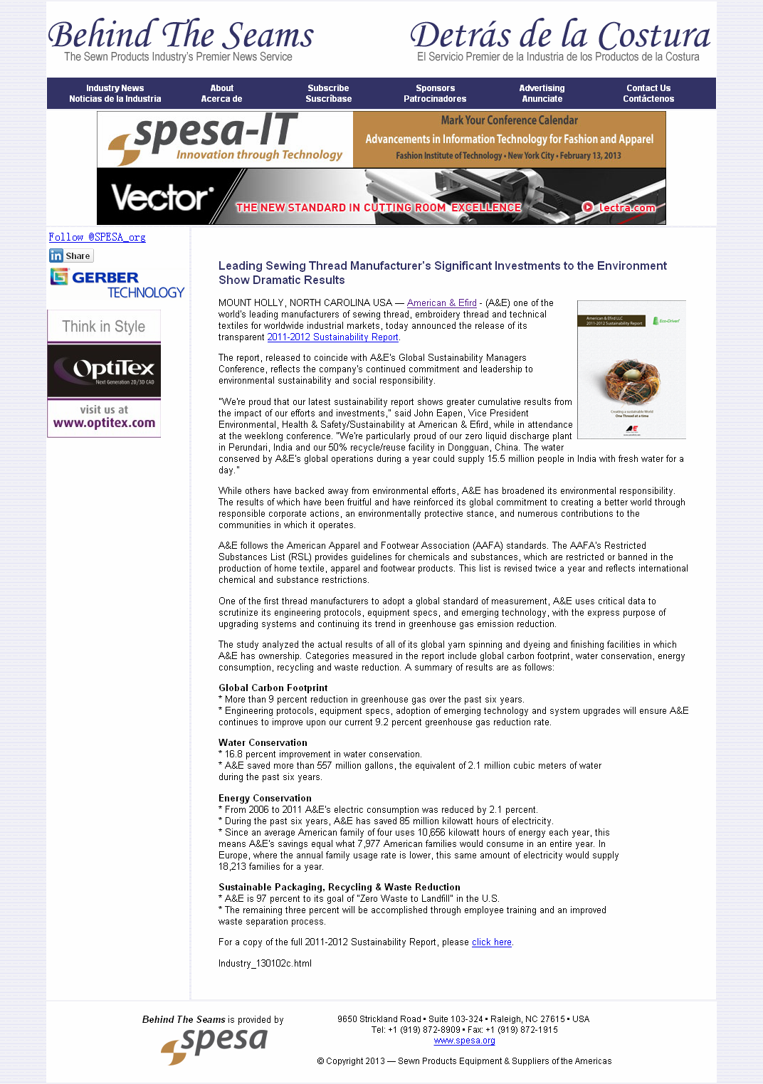 报道中说,A&E作为世界领先的缝纫线、绣花线和技术纺织品供应商,近期宣布其2011年—2012年可持续发展方案。此方案反映了A&E对环境保护和可持续发展的关注,并通过孜孜不倦的努力使其结出了丰硕的成果。A&E向全球承诺,我们将创造一个更美好的世界,通过负责任的企业行动、坚定保护环境的立场,从而使A&E足迹遍布之处留下更多绿意。