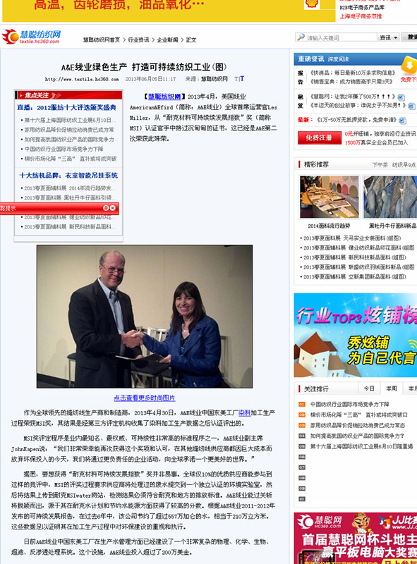 近日,《慧聪纺织网》刊文关注A&E线业。