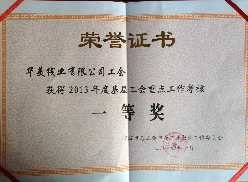 2013年在公司领导的关心和支持下,在各工会委员的组织协调下,工会开展了各类丰富多彩,形式多样的业余活动,旨在提高员工的文化生活质量,提倡员工关爱,帮助困难职工,以及倡导和谐企业氛围,通过大家的配合,华美线业有限公司工会被宁波市总工会市属工业企业工作委员会授于了《2013年度基层工会重点工作考核一等奖》的荣誉证书及基层工会财务工作先进单位称号。